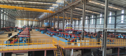 原礦經過三段一閉路破碎系統,采用一段閉路磨礦流程,磨礦細度為-100目占62%,經過一次粗選一次掃選,粗精礦濃縮脫水后再磨,磨后精礦進行三磨四選后進行濕式篩分,正目石墨經過一磨兩選后進入壓濾烘干系統,正目產品進行分目包裝,篩分負目經過一次濃縮浮選,再進行三磨四選,進入壓濾烘干包裝系統,尾礦濕排至尾礦庫。